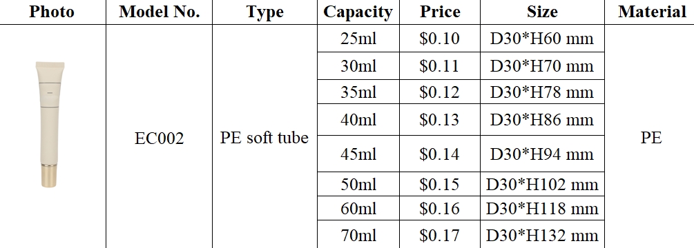 Product Description: The EC002 Custom PE Squeezable Tube for Eye Cream is a versatile and practical packaging solution designed to meet the needs of modern skincare and cosmetic products. This squeezable tube is made from high-quality PE material, ensuring durability and flexibility while maintaining the product’s integrity. The D30 cylindrical shape provides a sleek and ergonomic design that fits comfortably in your hand, making it easy to dispense the perfect amount of product every time. Available in various capacities ranging from 25ml to 70ml, this tube is ideal for eye creams, serums, and other targeted skincare treatments.