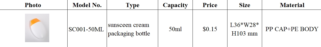 The 50ml Sunblock Cream Packaging Bottle (Model No.: SC001-50ML) is designed to be a durable and efficient container for your sunscreen products. This bottle is constructed with a PP cap and a PE body, ensuring that your products are stored securely and maintain their quality over time.