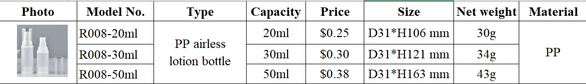 Friendly Design: The D31 cylindrical design of the R008 bottle is not only aesthetically pleasing but also practical, allowing for easy and controlled dispensing of lotions and creams. The airless technology prevents oxidation and contamination, ensuring your product remains fresh and effective for longer periods.